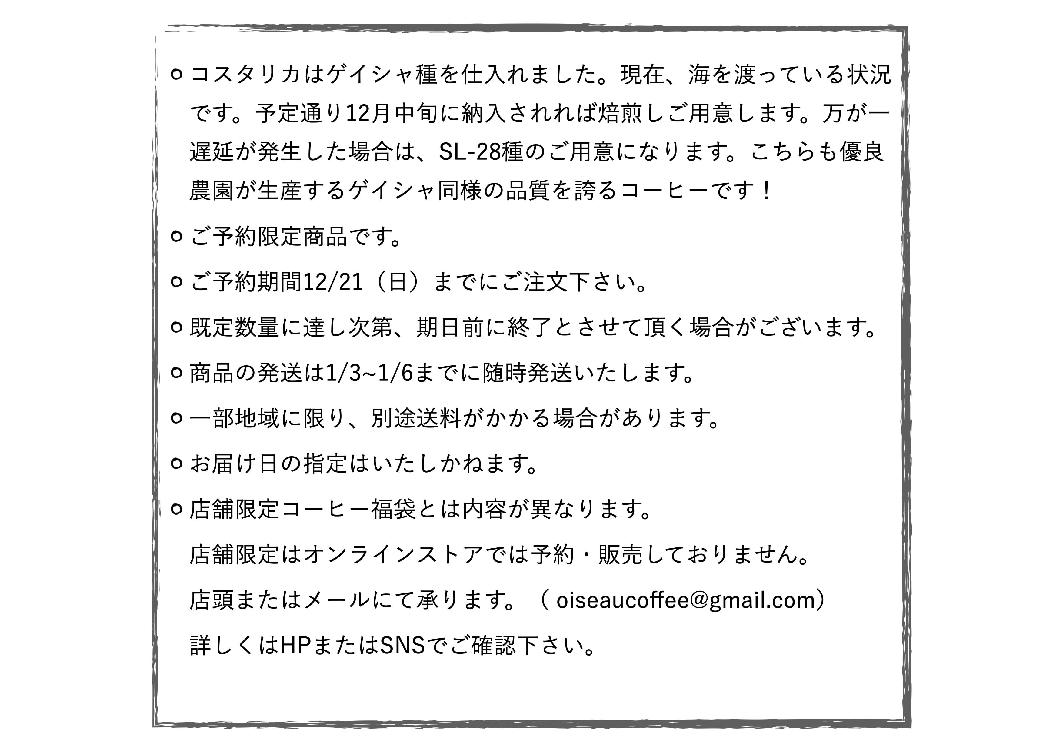 【希少豆 ゲイシャ種・競技会優勝焙煎豆・福袋限定"迎春ブレンド"】の入った贅沢な内容になっております。